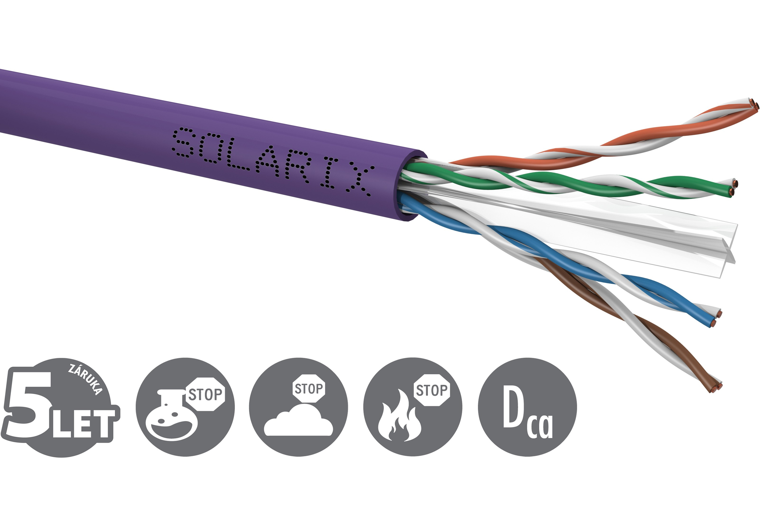 Instalační kabel Solarix s označením SXKD-6-UTP-LSOH je spolehlivý nestíněný kabel kategorie 6, který je testován až do šířky pásma 450 MHz, a je určený pro provoz ethernetových protokolů, včetně 2.5GBASE-T a 5GBASE-T. Konstrukce kabelu je U/UTP s plastovým křížem, který zajišťuje maximální oddělení párů od sebe po celé délce kabelu. Typ pláště je LSOH s třídou reakce na oheň Dca-s2,d2,a1. Vodiče kabelu jsou vyrobeny z kvalitního měděného drátu s čistotou mědi 99,97 %. Kabel bez problémů splňuje požadavky z mezinárodních standardů ISO/IEC 11801, EN 50173 a ANSI/TIA 568.2-D. Výkonové parametry tohoto kabelu byly otestovány nezávislou testovací zkušebnou FORCE TECHNOLOGY v rámci programu EC Verified, a to na nejvyšší úroveň tzv. Component Level. Certifikát je k dispozici zde na webu v záložce "Odkazy" nebo přímo na stránkách laboratoře FORCE. V případě CPR (nařízení EU č. 305/2011) je kabel testován v systému posuzování vlastností AVCP 3. Stejně jako ostatní kabely Solarix, je i kabel SXKD-6-UTP-LSOH značen metráží po 1 m v rozsahu od 0 do 305 m. Kabel je dodáván ve vysoce odolném třívrstvém leštěném kartónovém boxu, na kterém jsou uvedeny všechny nezbytné produktové informace, včetně čárových kódů, výrobní šarže, popisu a nejdůležitějších technických parametrů.