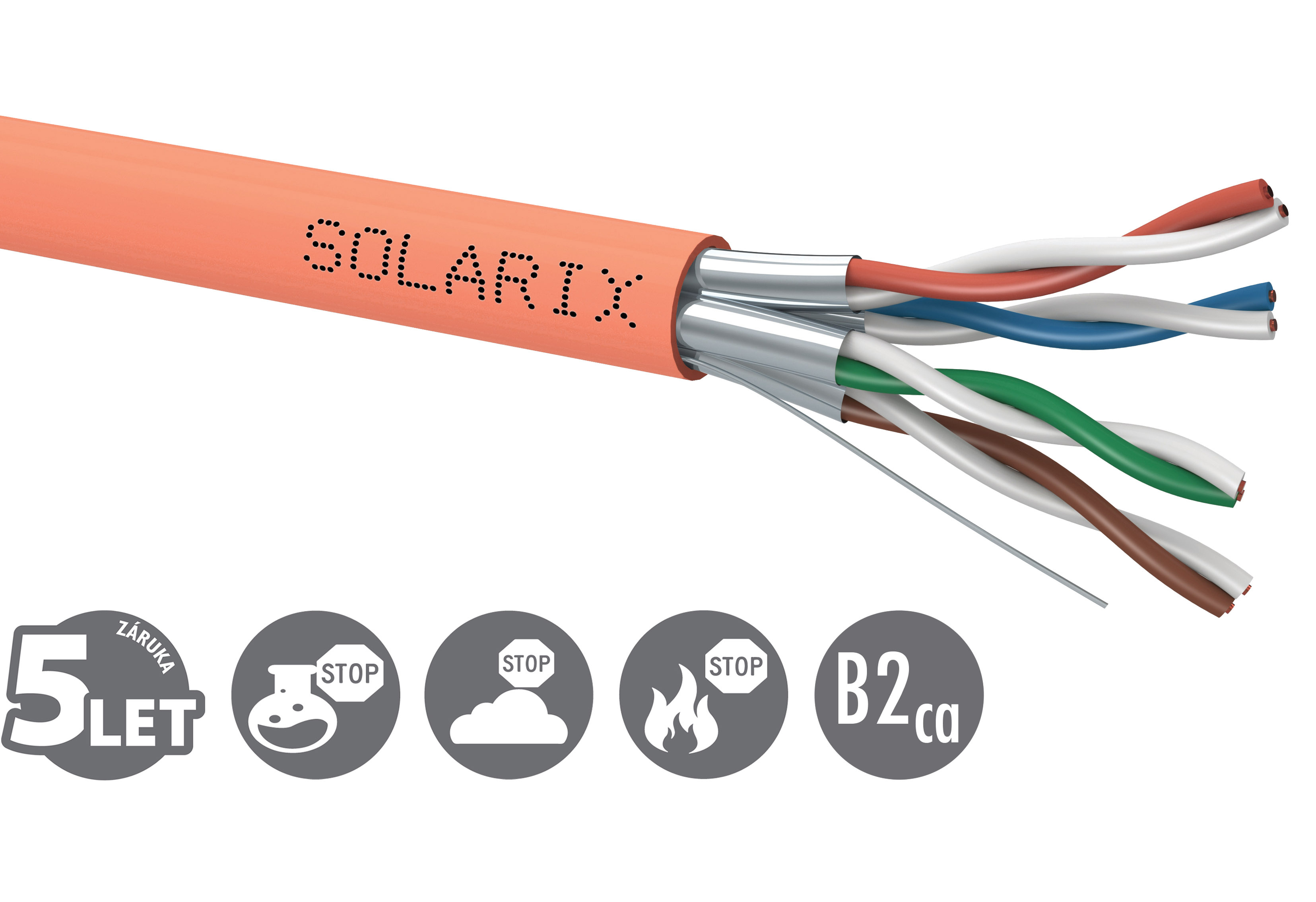 Instalační kabel Solarix s označením SXKD-6A-STP-LSOH-B2ca je vysoce kvalitní stíněný kabel kategorie 6A, který je určený pro provoz vysokorychlostních ethernetových protokolů, včetně 10GBASE-T. Konstrukce kabelu je U/FTP, typ pláště LSOH s třídou reakce na oheň B2ca-s1,d1,a1. Vodiče kabelu jsou vyrobeny z kvalitního měděného drátu s čistotou mědi 99,97 %. Kabel bez problémů splňuje požadavky z mezinárodních standardů ISO/IEC 11801, EN 50173 a ANSI/TIA 568.2-D. Výkonové parametry tohoto kabelu byly otestovány nezávislou testovací zkušebnou FORCE TECHNOLOGY v rámci programu EC Verified, a to na nejvyšší úroveň tzv. Component Level. Certifikát je k dispozici zde na webu v záložce "Odkazy" nebo přímo na stránkách laboratoře FORCE. V případě CPR (nařízení EU č. 305/2011) je kabel testován v systému posuzování vlastností AVCP 1+ a rovněž splňuje vyhlášku MV ČR č. 23/2008 resp. vyhlášku č. 268/2011 o technických podmínkách požární ochrany staveb a je vhodný pro způsoby použití odpovídající kabelu s touto třídou reakce na oheň, které jsou definovány v Příloze č. 2 těchto vyhlášek. Stejně jako ostatní kabely Solarix, je i kabel SXKD-6A-STP-LSOH-B2ca značen metráží po 1 m v rozsahu od 0 do 500 m. Kabel je dodáván na vysoce pevné dřevěné cívce, na které jsou uvedeny všechny nezbytné produktové informace, včetně čárových kódů, výrobní šarže, popisu a nejdůležitějších technických parametrů.
