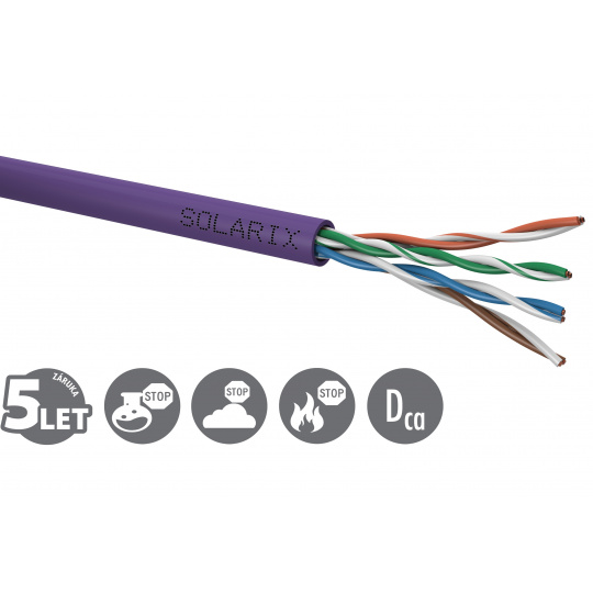 Instalační kabel Solarix s označením SXKD-5E-UTP-LSOH je spolehlivý nestíněný kabel kategorie 5E, který je testován až do šířky pásma 350 MHz, a je určený pro provoz ethernetových protokolů, včetně 2.5GBASE-T a 5GBASE-T*. Konstrukce kabelu je U/UTP, typ pláště LSOH s třídou reakce na oheň Dca-s1,d2,a1. Vodiče kabelu jsou vyrobeny z kvalitního měděného drátu s čistotou mědi 99,97%. Kabel bez problémů splňuje požadavky z mezinárodních standardů ISO/IEC 11801, EN 50173 a ANSI/TIA 568.2-D. Výkonové parametry tohoto kabelu byly otestovány nezávislou testovací zkušebnou FORCE TECHNOLOGY v rámci programu EC Verified, a to na nejvyšší úroveň tzv. Component Level. Certifikát je k dispozici zde na webu v záložce "Odkazy" nebo přímo na stránkách laboratoře FORCE. V případě CPR (nařízení EU č. 305/2011) je kabel testován v systému posuzování vlastností AVCP 3. Stejně jako ostatní kabely Solarix, je i kabel SXKD-5E-UTP-LSOH značen metráží po 1 m v rozsahu od 0 do 500 m. Kabel je dodáván ve vysoce odolném třívrstvém leštěném kartónovém boxu (vždy barevně odlišeném podle typu kabelu), na kterém jsou uvedeny všechny nezbytné produktové informace, včetně čárových kódů, výrobní šarže, popisu a nejdůležitějších technických parametrů.