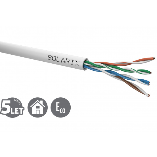 POZOR, nový 100 m box. Instalační kabel Solarix s označením SXKD-5E-UTP-PVC je spolehlivý nestíněný kabel kategorie 5E, který je určený pro provoz ethernetových protokolů, včetně 2.5GBASE-T a 5GBASE-T*. Konstrukce kabelu je U/UTP, typ pláště PVC s třídou reakce na oheň Eca. Vodiče kabelu jsou vyrobeny z kvalitního měděného drátu s čistotou mědi 99,97 %. Kabel bez problémů splňuje požadavky z mezinárodních standardů ISO/IEC 11801, EN 50173 a ANSI/TIA 568.2-D. V případě CPR (nařízení EU č. 305/2011) je kabel testován u nezávislé laboratoře FORCE TECHNOLOGY v systému posuzování vlastností AVCP 3. Stejně jako ostatní kabely Solarix, je i kabel SXKD-5E-UTP-PVC značen metráží po 1 m v rozsahu od 0 do 100 m. Kabel je dodáván ve vysoce odolném třívrstvém leštěném kartónovém boxu (vždy barevně odlišeném podle typu kabelu), na kterém jsou uvedeny všechny nezbytné produktové informace, včetně čárových kódů, výrobní šarže, popisu a nejdůležitějších technických parametrů.