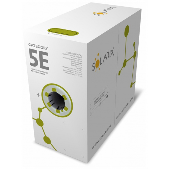 Instalační kabel Solarix s označením SXKD-5E-UTP-PVC je spolehlivý nestíněný kabel kategorie 5E, který je určený pro provoz ethernetových protokolů, včetně 2.5GBASE-T a 5GBASE-T*. Konstrukce kabelu je U/UTP, typ pláště PVC s třídou reakce na oheň Eca. Vodiče kabelu jsou vyrobeny z kvalitního měděného drátu s čistotou mědi 99,97 %. Kabel bez problémů splňuje požadavky z mezinárodních standardů ISO/IEC 11801, EN 50173 a ANSI/TIA 568.2-D. V případě CPR (nařízení EU č. 305/2011) je kabel testován u nezávislé laboratoře FORCE TECHNOLOGY v systému posuzování vlastností AVCP 3. Stejně jako ostatní kabely Solarix, je i kabel SXKD-5E-UTP-PVC značen metráží po 1 m v rozsahu od 0 do 500 m. Kabel je dodáván ve vysoce odolném třívrstvém leštěném kartónovém boxu (vždy barevně odlišeném podle typu kabelu), na kterém jsou uvedeny všechny nezbytné produktové informace, včetně čárových kódů, výrobní šarže, popisu a nejdůležitějších technických parametrů.