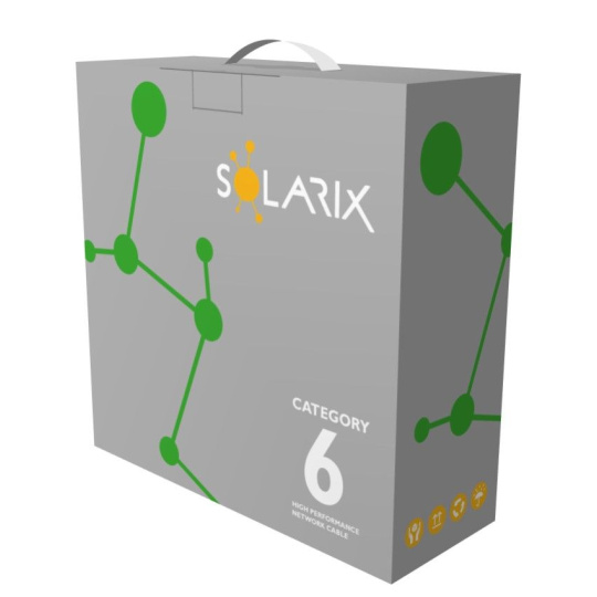 POZOR, nový 100 m box. Instalační kabel Solarix s označením SXKD-6-UTP-PVC je spolehlivý nestíněný kabel kategorie 6, který je určený pro provoz ethernetových protokolů, včetně 2.5GBASE-T a 5GBASE-T. Konstrukce kabelu je U/UTP s plastovým křížem, který zajišťuje maximální oddělení párů od sebe po celé délce kabelu. Typ pláště je PVC s třídou reakce na oheň Eca. Vodiče kabelu jsou vyrobeny z kvalitního měděného drátu s čistotou mědi 99,97 %. Kabel bez problémů splňuje požadavky z mezinárodních standardů ISO/IEC 11801, EN 50173 a ANSI/TIA 568.2-D. V případě CPR (nařízení EU č. 305/2011) je kabel testován u nezávislé laboratoře FORCE TECHNOLOGY v systému posuzování vlastností AVCP 3. Stejně jako ostatní kabely Solarix, je i kabel SXKD-6-UTP-PVC značen metráží po 1 m v rozsahu od 0 do 100 m. Kabel je dodáván ve vysoce odolném třívrstvém leštěném kartónovém boxu, na kterém jsou uvedeny všechny nezbytné produktové informace, včetně čárových kódů, výrobní šarže, popisu a nejdůležitějších technických parametrů.