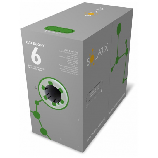 Instalační kabel Solarix s označením SXKD-6-UTP-PVC je spolehlivý nestíněný kabel kategorie 6, který je určený pro provoz ethernetových protokolů, včetně 2.5GBASE-T a 5GBASE-T. Konstrukce kabelu je U/UTP s plastovým křížem, který zajišťuje maximální oddělení párů od sebe po celé délce kabelu. Typ pláště je PVC s třídou reakce na oheň Eca. Vodiče kabelu jsou vyrobeny z kvalitního měděného drátu s čistotou mědi 99,97 %. Kabel bez problémů splňuje požadavky z mezinárodních standardů ISO/IEC 11801, EN 50173 a ANSI/TIA 568.2-D. V případě CPR (nařízení EU č. 305/2011) je kabel testován u nezávislé laboratoře FORCE TECHNOLOGY v systému posuzování vlastností AVCP 3. Stejně jako ostatní kabely Solarix, je i kabel SXKD-6-UTP-PVC značen metráží po 1 m v rozsahu od 0 do 305 m. Kabel je dodáván ve vysoce odolném třívrstvém leštěném kartónovém boxu, na kterém jsou uvedeny všechny nezbytné produktové informace, včetně čárových kódů, výrobní šarže, popisu a nejdůležitějších technických parametrů.