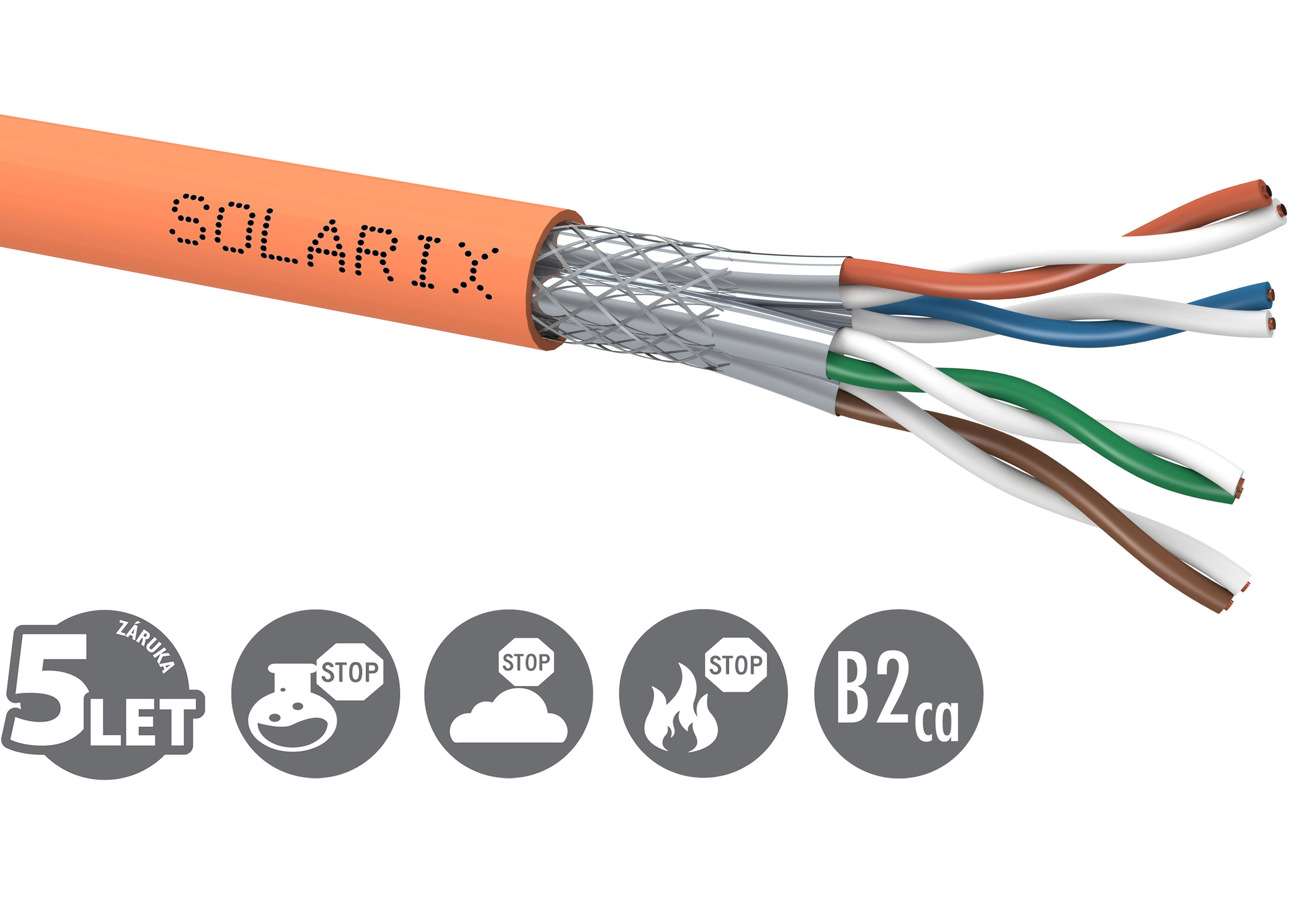 Instalační kabel Solarix s označením SXKD-7A-1200-SSTP-LSOHFR-B2ca je vysoce kvalitní dvakrát stíněný kabel kategorie 7A, který je testovaný až do šířky pásma 1 200 MHz a je určený pro provoz vysokorychlostních ethernetových protokolů, včetně 10GBASE-T. Konstrukce kabelu je S/FTP, typ pláště LSOHFR s třídou reakce na oheň B2ca-s1,d1,a1. Vodiče kabelu jsou vyrobeny z kvalitního měděného drátu s čistotou mědi 99,97 %. Kabel bez problémů splňuje požadavky z mezinárodních standardů ISO/IEC 11801 a EN 50173. Výkonové parametry tohoto kabelu byly otestovány nezávislou testovací zkušebnou FORCE TECHNOLOGY v rámci programu EC Verified, a to na nejvyšší úroveň tzv. Component Level. Certifikát je k dispozici zde na webu v záložce "Odkazy" nebo přímo na stránkách laboratoře FORCE. V případě CPR (nařízení EU č. 305/2011) je kabel testován u nezávislé laboratoře FORCE CERTIFICATION v systému posuzování vlastností AVCP 1+ a rovněž splňuje vyhlášku MV ČR č. 23/2008 resp. vyhlášku č. 268/2011 o technických podmínkách požární ochrany staveb a je vhodný pro způsoby použití odpovídající kabelu s touto třídou reakce na oheň, které jsou definovány v Příloze č. 2 těchto vyhlášek. Stejně jako ostatní kabely Solarix, je i kabel SXKD-7A-1200-SSTP-LSOHFR-B2ca značen metráží po 1 m v rozsahu od 0 do 500 m. Kabel je dodáván na vysoce pevné dřevěné cívce, na které jsou uvedeny všechny nezbytné produktové informace, včetně čárových kódů, výrobní šarže, popisu a nejdůležitějších technických parametrů. Technické parametry Kategorie: CAT7A Podporované protokoly: 10GBASE-T a nižší Stínění: fólie kolem každého páru a oplet Šířka pásma: testováno do 1 200 MHz Typ a velikost vodiče: měděný drát 0,58 mm ± 0,005 mm Izolace a průměr vodiče s izolací: skin-foam-skin PE 1,35 mm Třída reakce na oheň; typ pláště: B2ca-s1,d1,a1; LSOHFR Barva pláště: oranžová RAL 2003 Průměr kabelu: 7,8 mm Váha: 61,65 kg/km NVP: 79 % Propagation delay: 480 ns/100 m Delay skew: větší než 25 ns/100 m Skladovací teplota: -20 °C až 60 °C Provozní teplota: -20 °C až 60 °C Teplota při instalaci: 0 °C až 50 °C Balení: 500 m, dřevěná cívka Rozměry balení (průměr x výška): 380 mm x 390 mm Počet balení na paletě: 27 cívek
