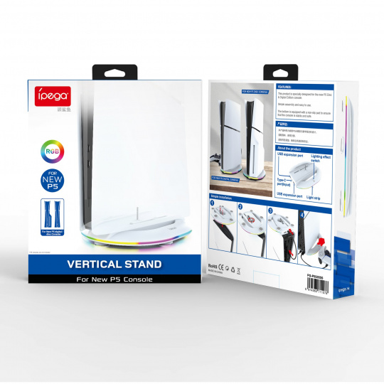 Stylový a praktický doplněk pro tvou konzoli! Vertikální stojan iPega P5S035SA dodá PlayStationu 5 Slim nebo Pro stabilitu a atraktivní vzhled díky plnému RGB podsvícení.