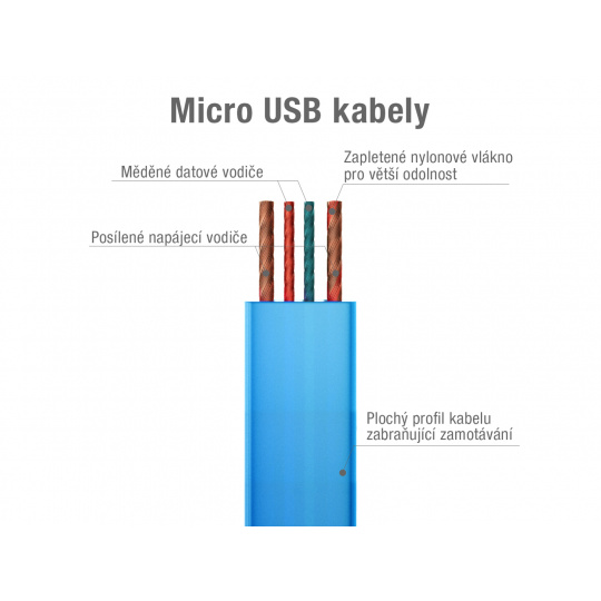 Kabel USB A - Micro USB vhodný pro nabíjení a přenos dat. Povrchový materiál a plochý tvar zaručí snadnou manipulaci a dlouhou životnost kabelu.