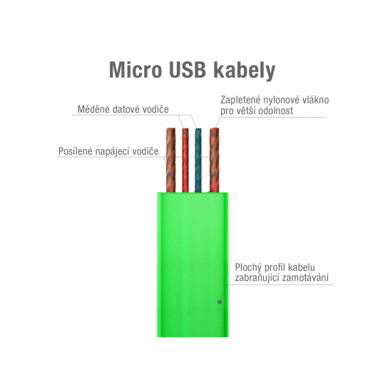 Kabel USB A - Micro USB vhodný pro nabíjení a přenos dat. Povrchový materiál a plochý tvar zaručí snadnou manipulaci a dlouhou životnost kabelu.