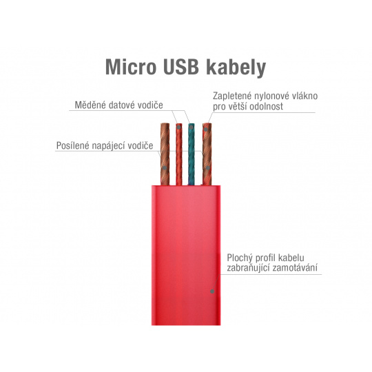 Kabel USB A - Micro USB vhodný pro nabíjení a přenos dat. Povrchový materiál a plochý tvar zaručí snadnou manipulaci a dlouhou životnost kabelu.