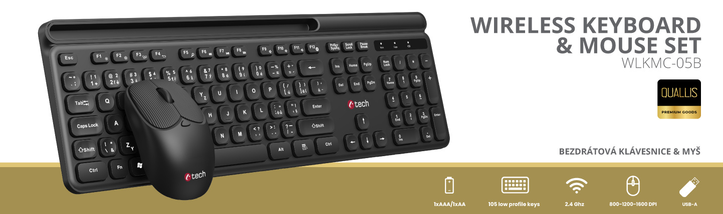 Klávesnice C-TECH Quallis WLKMC-05, bezdrátový combo set s myší, černý, USB, CZ/SK