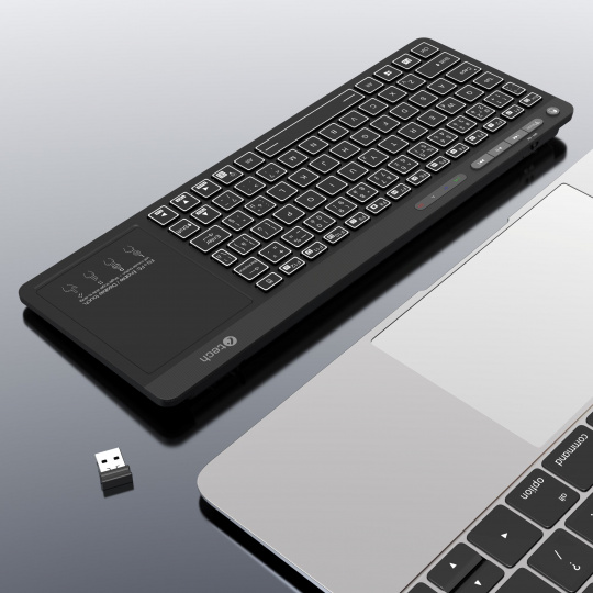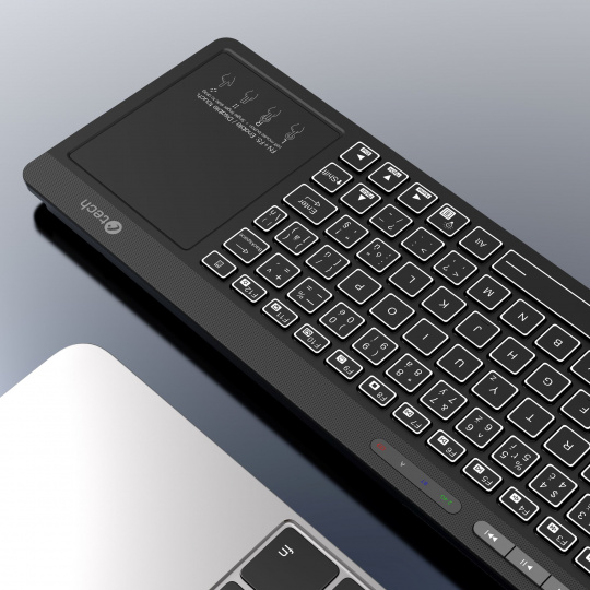 Klávesnice obsahuje plnohodnotný touchpad, který zcela nahrazuje externí myš. Můžete tak ovládat kurzor, klikání i základní gesta přímo z klávesnice – což je praktické zejména při ovládání chytré TV, tabletu nebo při práci v omezeném prostoru.