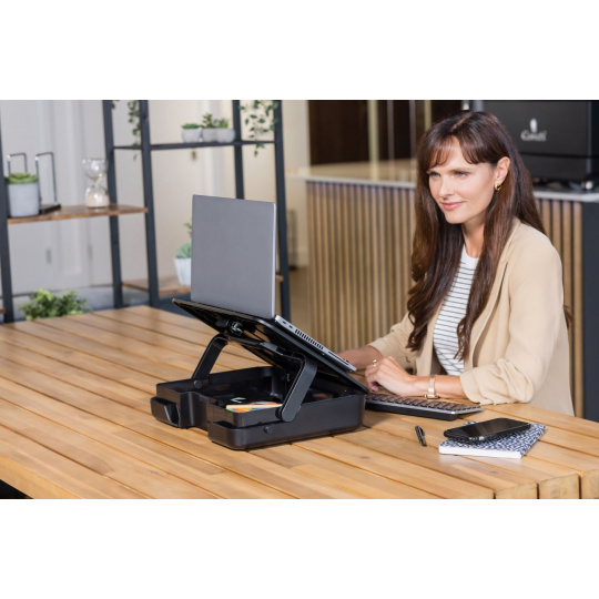 Dva produkty v jednom - uzavíraný ochranný kufřík se zabudovanou podložkou/stojanem pod notebook. Používání stojanu na notebook podporuje zdravější pozici při práci s notebookem. Redukuje napětí zad, uvolňuje napětí krční páteře a usnadňuje zachování správného držení těla. Kufřík se perfektně hodí pro flexibilní práci na různých místech.