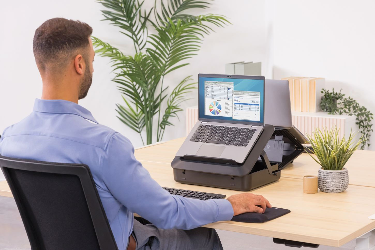 Dva produkty v jednom - uzavíraný ochranný kufřík se zabudovanou podložkou/stojanem pod notebook. Používání stojanu na notebook podporuje zdravější pozici při práci s notebookem. Redukuje napětí zad, uvolňuje napětí krční páteře a usnadňuje zachování správného držení těla. Kufřík se perfektně hodí pro flexibilní práci na různých místech.