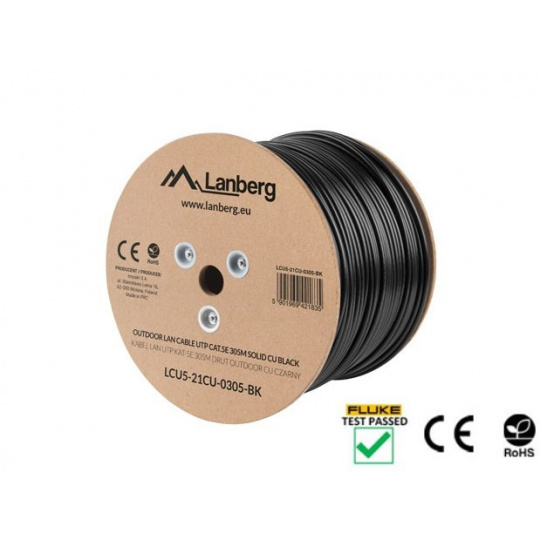 LANBERG LAN KABEL CAT.5E UTP 305M PEVNÝ VENKOVNÍ CU ČERNÝ FLUKE PASS