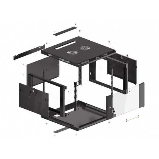 - V ceně: taška na příslušenství, zemnící sada (kolíky, zemnící kabel, matice a montážní podložky), zámek předních dveří, dva boční panely se zámky, 12 klecových matic M6.