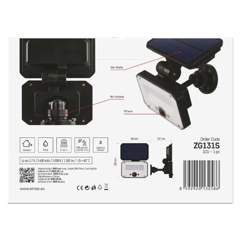 Značka EMOS Objednací číslo ZG131S Produktové číslo 1552131000 EAN 8592920132586 příkon – světelný tok 1 500 lm krytí IP54 PIR senzor ano napájení solární řada neuvádí se použití povrchová montáž zdroj světla LED teplota chromatičnosti 3 000 K kategorie CLASSIC barva světla teplá bílá index podání barev (CRI) Ra > 80 dosah PIR senzoru 6 m rozsah pracovní teploty -10 °C až +40 °C životnost neuvádí se barva černá napětí 3,7 V délka přívodního kabelu neuvádí se akumulátor Li-Ion 3 600 mAh materiál difuzoru plast (PC) typ přívodního kabelu neuvádí se materiál těla plast (ABS+PC) stmívání neuvádí se doba svícení na AKU neuvádí se flicker-free nebliká frekvence neuvádí se materiál přívodního kabelu neuvádí se počet průchozích zásuvek neuvádí se proud neuvádí se stupeň ochrany proti mechanickým nárazům neuvádí se světelná účinnost neuvádí se typ průchozích zásuvek neuvádí se účiník neuvádí se úhel vyzařování 110° zkušební žárovka součástí balení ne typ stmívání – záruční doba 3 roky rozměr 180 × 146 × 122 mm energetická třída použitého světelného zdroje neuvádí se prodejní obal 1 ks, krabice