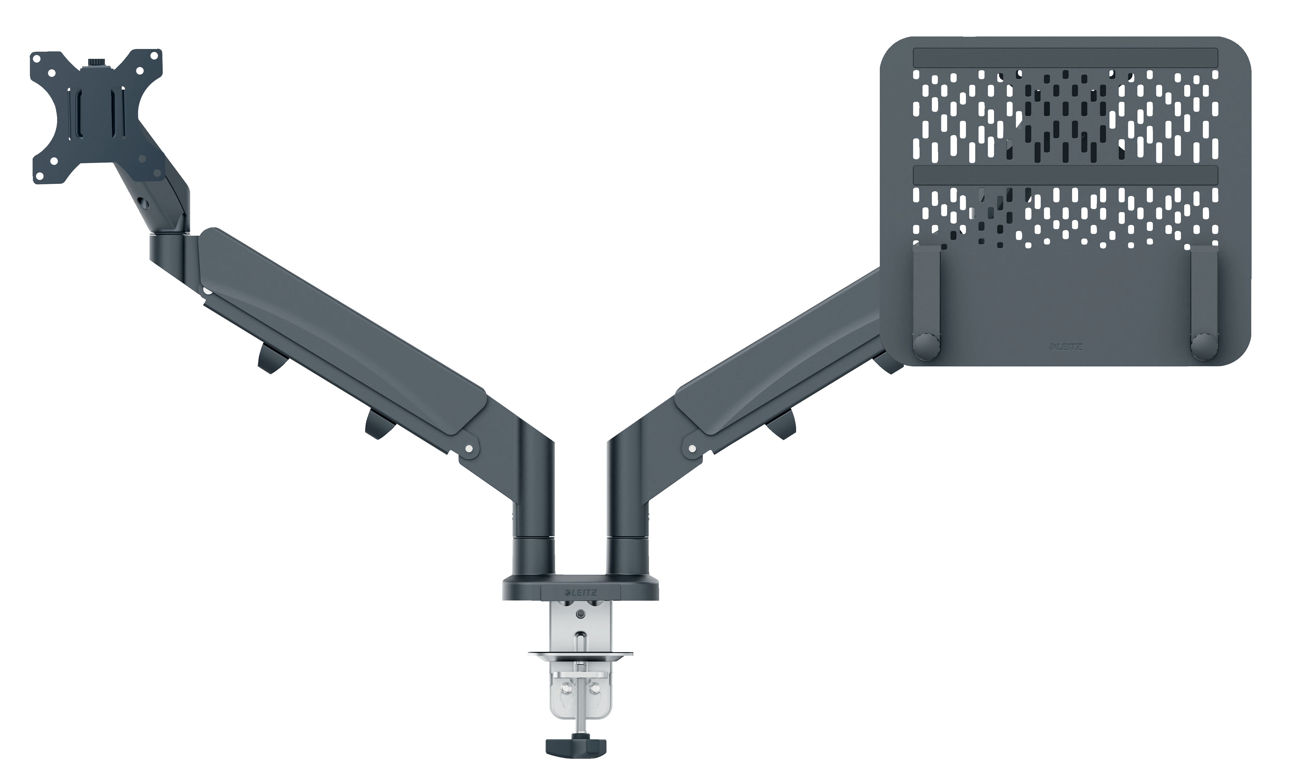 Pří správném ergonomickém nastavení podle doporučení má duální prostorově úsporné rameno Leitz pro monitor a laptop pozitivní vliv na držení těla, podporuje správný úhel pro sledování a zlepšuje komfort a pohodlí krku a ramen. Držák monitoru zůstává stabilní ve všech výškách a úhlech a umožňuje snadné přetáčení monitoru na šířku a na výšku. Svým designem se hodí tam, kde je málo místa, umožní vám získat cenné místo na pracovní ploše. Ergonomicky navržené tak, aby podporovalo pracovní tělesnou pohodu a zvyšovalo produktivitu.