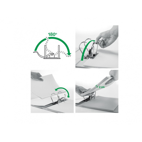 Unikátní páková mechanika s otevřením o 180°, která umožňuje o 50 % širší otevření a o 20 % rychlejší práci s pořadačem