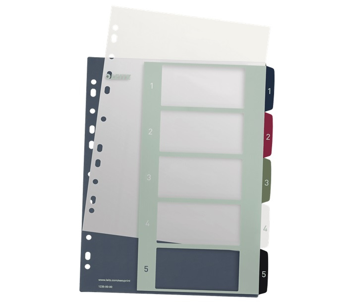 Opakovatelně použitelný a extra odolný plastový rejstřík ve stylových barvách.. Potisknutelný na PC pro upravení dle vlastních potřeb pomocí nástroje na www.leitz.com/easyprint