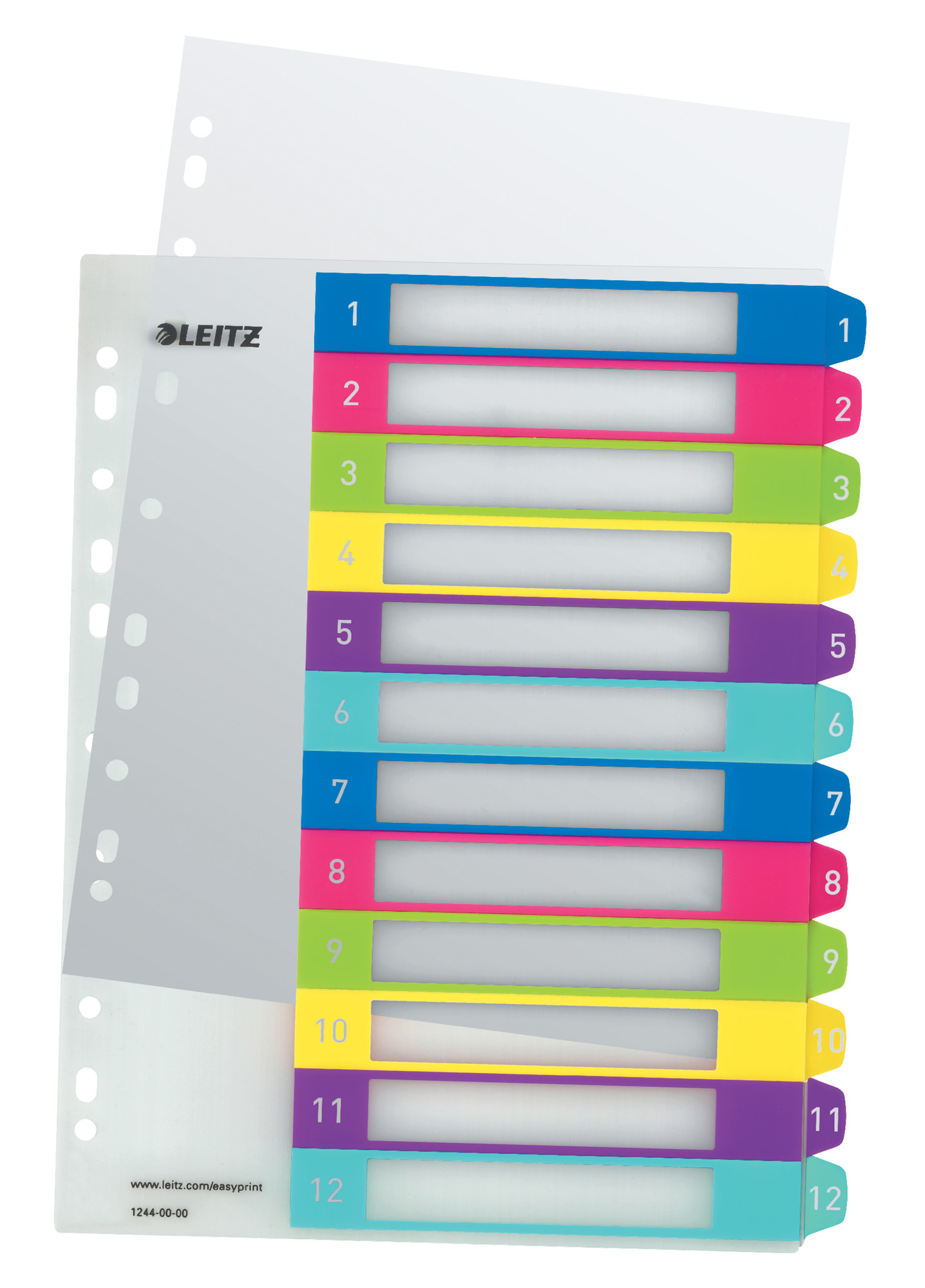 Opakovatelně použitelný a extra odolný plastový rejstřík v zářivých barevných kombinacích. Potisknutelný na PC pro upravení dle vlastních potřeb pomocí nástroje na www.leitz.com/easyprint