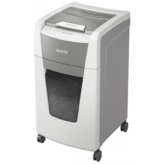 Plně automatická skartovačka papíru od firmy Leitz s jedinečnou čistou vyprazdňovací funkcí. Je tak inteligentní, že tiše pracuje sama, jen vložte stoh papíru (včetně sponek a svorek), zavřete víko a jděte si po své práci. Ideální pro použití pro kanceláře. Vysoká bezpečnost a vynikající výkon s touto skartovačkou s automatickým podáváním, s funkcí proti zaseknutí papíru, tichou a s dlouhým provozem (60 minut). Automaticky skartuje 300 listů A4 s úrovní zabezpečení P5 (2x15 mm) s mikro řezem do velkého koše s objemem 60 l. Jednoduché ovládání pomocí dotekových prvků.