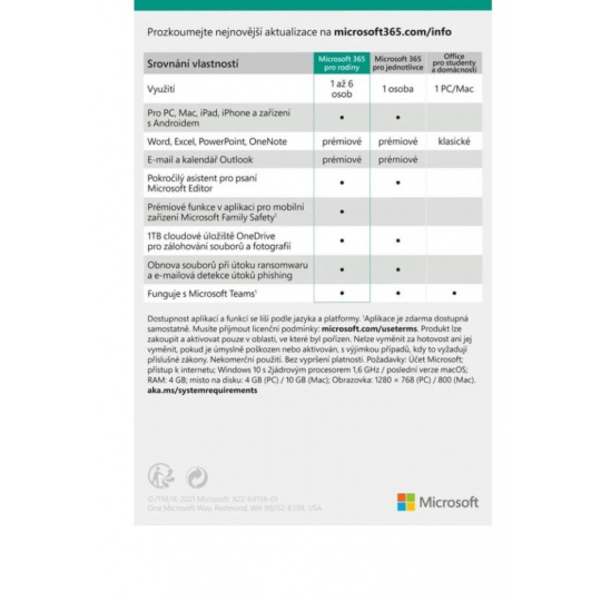 Microsoft 365 Family. Roční předplatné pro až 6 osob, kompatibilní s Windows i macOS. Obsahuje prémiové aplikace Office a rozšířené cloudové služby.