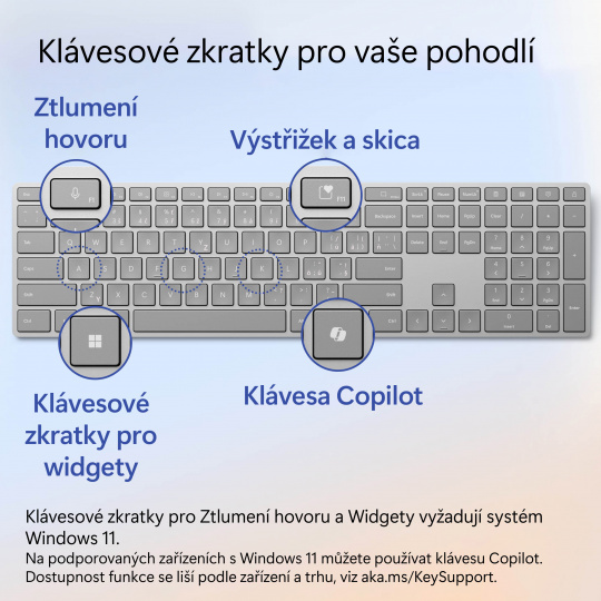 Díky klávese Copilota u klávesnice pro Surface máte ve Windows 11 výhody umělé inteligence na dosah ruky. Tahle elegantní klávesnice umožňuje klasické psaní se zabudovanou numerickou částí a vyhrazenými klávesami pro rychlý přístup k funkcím výstřižky a skica, expresivní vstup, ztlumení hovoru a dalším.