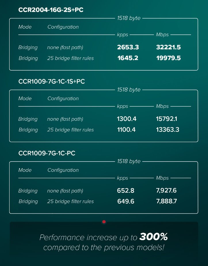 CCR2004-16G-2S+PC je desktopový nebo rackmount router do 19" racku z nové řady CCR routerů, která přichází s pasivním chlazením a nejvyšším poměrovým výkonem na 1 jádro ze všech CCR, což je nejdůležitější aspekt, pokud jde o náročnější operace založené na processing per-connection (např. QoS). Router je poháněn CPU s 64bit ARM architekturou s taktem 1200 MHz, má 4GB RAM typu DDR4 a 128MB NAND uložiště.