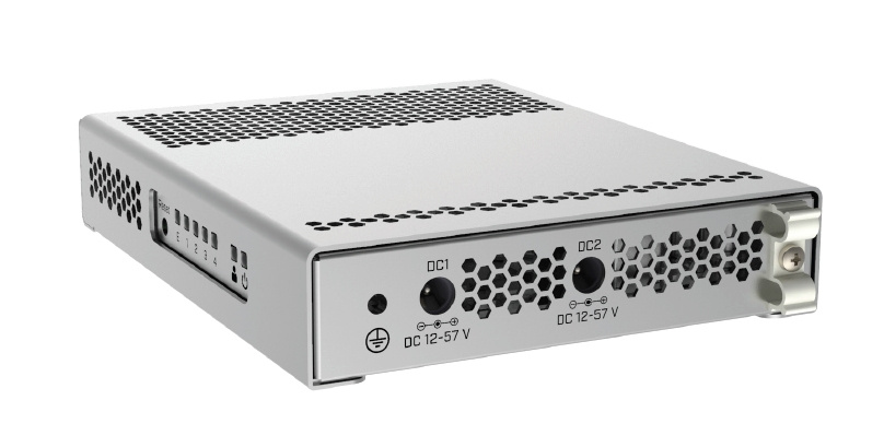 Switch je vybaven dvěma redundantními napájecími vstupy zdroji (12 - 57V DC jack) a pasivním chladičem umožňující tichý provoz.