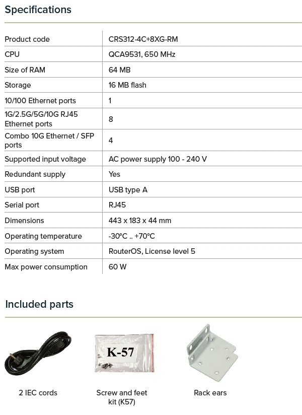 CRS312-4C+8XG-RM dále disponuje redundantním napájením, standardním USB vstupem, konzolovým konfiguračním portem.