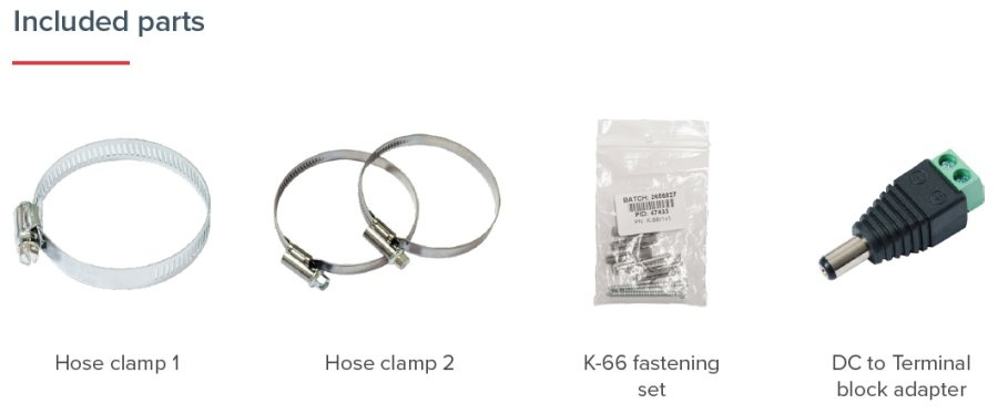 Součástí balení jsou pásky k uchycení na sloup a napájecí redukce.