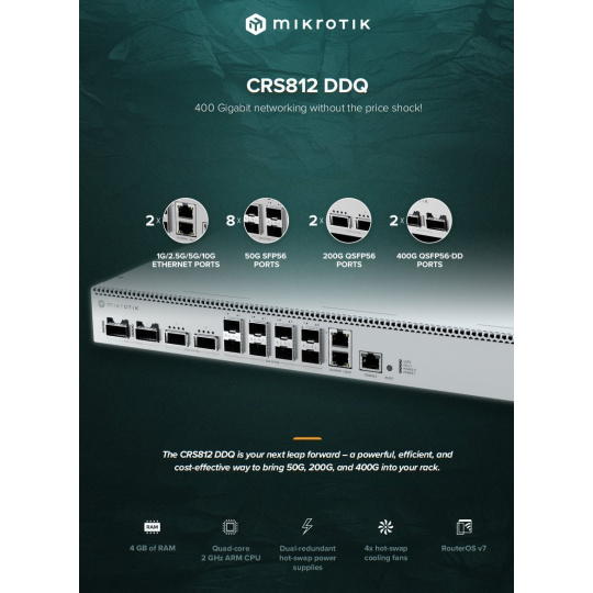 CRS812 DDQ představuje novou generaci síťových switchů s podporou 400 Gigabit Ethernet za dostupnou cenu. Vybaven moderním Marvell switch chipem 98DX7335 a výkonným quad-core ARM procesorem AL52400 s frekvencí 2 GHz, poskytuje pokročilé routing, switching a traffic management funkce známé z milionů RouterOS nasazení.