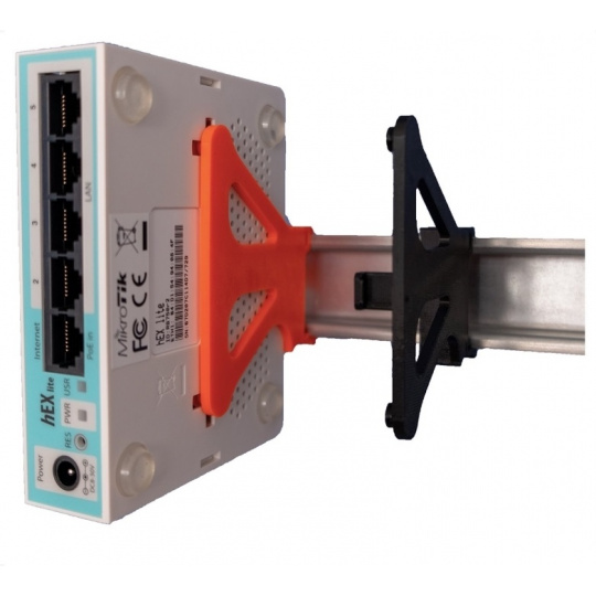 Plastový držák na DIN lištu umožňující vertikální uchycení Mikrotik aktivních prvků série hAP a hEX v racku.