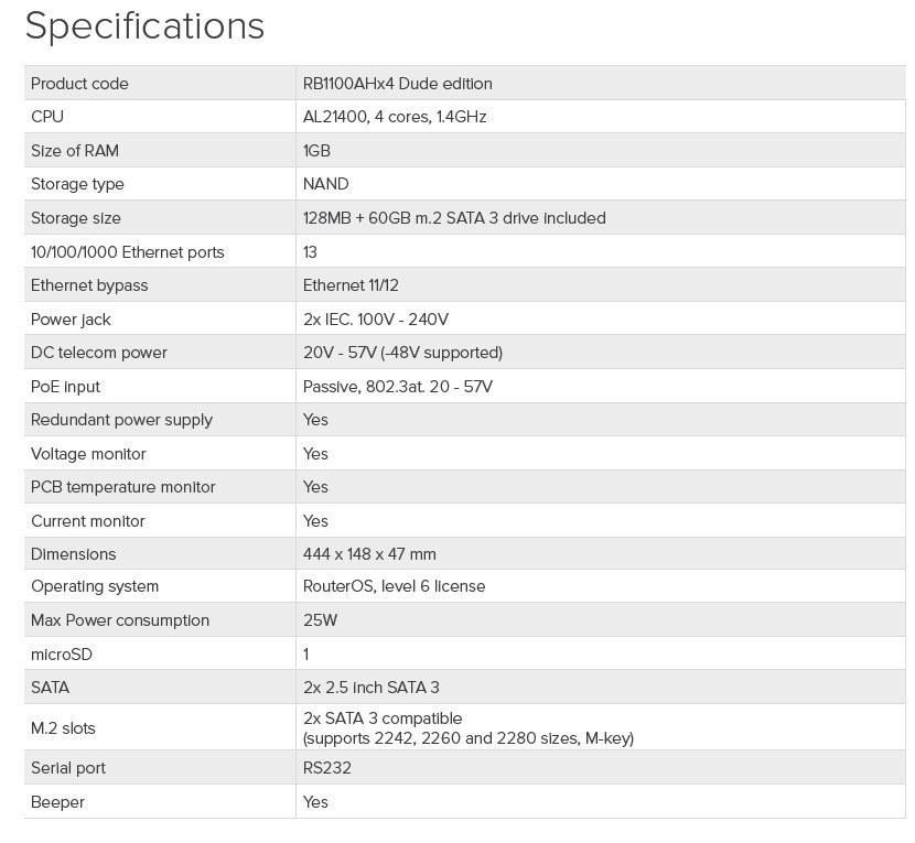 Verze s diskem Součástí základní instalace verze Dude Edition je balíček DUDE, který je ideální pro monitoring celé sítě. Kromě on-line monitoringu umí i např. vzdálené upgrady všech Mikrotiků v síti. Systémové řešení platforem firmy MikroTik pro poskytovatele bezdrátového připojení k síti Internet. Nejvýkonější gigabytový routerboard v rack verzi osazený 13x RJ45 10/100/1000 Mbps MDI/MDI-X. Aktivovaný ROS Level 6, slot pro SD kartu, dodávka včetně 1U hliníkové rack šasi a zdroje. Přepracovaný model RB1100AHx4 se čtyřmi jádry na frekvenci 1400 MHz dokáže zpracovat až 5,5 milionů packetů za sekundu (5x více oproti původnímu modelu a 5-ti násobný nárůst výkonu). Disponuje integrovaným 64 GB SSD diskem, redundantním zdrojem. Kromě dvojího napájení má ještě DC vstup a podporuje jak pasivní tak i aktivní PoE nápájení ve standardu 802.3at. RouterBoard má dva sloty M2 pro SSD disky, jeden je již osazen SSD diskem o kapacitě 60 GB. RouterBoard lze dále rozšířit o mikroSD kartu. Díky integrovanému hardwarovému akcelerátoru je ideální pro IPsec tunely. Technické specifikace: DHCP: Ano LAN porty: 13x 10/100/1000 Mbit/s Gigabit Ethernet, Auto-MDI/X Výchozí jméno: admin Spotřeba (W): 25 Procesor: PowerPC 4x 1400MHz with hardware encryption NAND (MB): 128 +60G Sloty: 2x SATA 3 Rozšíření: 1x micro SD card I/O Control: Ano LED indikace: Ano OS: RouterOS Level 6 Podpora IPv6: Plná Výška (mm): 47 Šířka (mm): 444 Hloubka (mm): 148 Napájení max (jack) (V): 2x 230, 57 Napájení min (PoE) (V): 20 Napájení max (PoE) (V): 57 Provozní teplota min (°C): -20 Upozornění: Výrobce MIKROTIK nevztahuje záruku na zařízení poškozená přepětím. Zařízení je třeba na vstupech adekvátně chránit proti indukovanému elektrostatickému přepětí či přepěťovým špičkám na silovém vedení. Při venkovních instalacích je třeba používat stíněnou kabeláž (FTP/SFTP), příslušné přepěťové ochrany (pokud nejsou integrovány) a provést korektní a efektivní uzemnění.