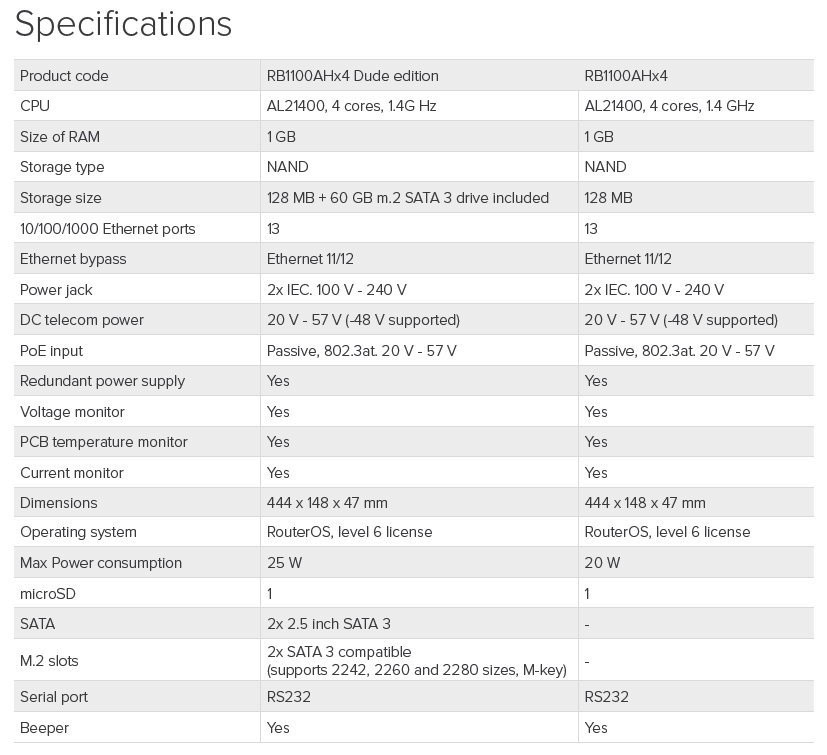 Verze bez disku Systémové řešení platforem firmy MikroTik pro poskytovatele bezdrátového připojení k síti Internet. Jedná se o gigabitový routerboard v rack verzi osazený 13x RJ45 10/100/1000 Mbps MDI/MDI-X. Aktivovaný ROS Level 6, slot pro SD kartu, seriový port RS232, dodávka včetně 1U hliníkové rack šasi a zdroje. Poháněný Annapurna Alpine AL21400 CPU se čtyřmi Cortex A15 jádry, každý taktován na 1.4GHz a propustností až 7.5Gbit. RB podporuje IPsec hardware acceleration (až 2.2Gbps s AES128). Kromě redundantního napájení má ještě DC vstup a podporuje jak pasivní tak i aktivní PoE nápájení ve standardu 802.3at. RouterBoard lze dále rozšířit o mikroSD kartu, díky integrovanému hardwarovému akcelerátoru je ideální pro IPsec tunely. Technické specifikace: DHCP: Ano LAN porty: 13x 10/100/1000 Mbit/s Gigabit Ethernet, Auto-MDI/X Výchozí jméno: admin Spotřeba (W): 25 Procesor: PowerPC 4x 1400MHz with hardware encryption NAND (MB): 128 Rozšíření: 1x micro SD card I/O Control: Ano LED indikace: Ano OS: RouterOS Level 6 Podpora IPv6: Plná Výška (mm): 47 Šířka (mm): 444 Hloubka (mm): 148 Napájení max (jack) (V): 2x 230, 57 Napájení min (PoE) (V): 20 Napájení max (PoE) (V): 57 Provozní teplota min (°C): -20 Chlazení: Pasivní (bez ventilátoru) Upozornění: Výrobce MIKROTIK nevztahuje záruku na zařízení poškozená přepětím. Zařízení je třeba na vstupech adekvátně chránit proti indukovanému elektrostatickému přepětí či přepěťovým špičkám na silovém vedení. Při venkovních instalacích je třeba používat stíněnou kabeláž (FTP/SFTP), příslušné přepěťové ochrany (pokud nejsou integrovány) a provést korektní a efektivní uzemnění. Stránky o produktu: https://routerboard.com/RB1100Dx4