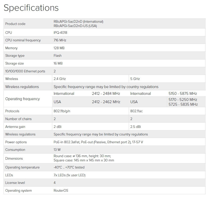 RBcAPGi-5acD2nD / cAP ac (stropní Access Point) je stropní dual band AP od MikroTiku s modulačními rychlostmi 300 Mbps (2.4GHz) a 866Mbps (5GHz). Navrženo bylo tak, aby maximálně splynulo s místem instalace, ideální pro hostinské činnosti, jako restaurace, hotely, letiště, nákupní centra, atd... cAP ac podporuje 802.11a/b/g/n/ac a může být napájeno pomocí pasivního PoE. Je to ideální zařízení pro MikroTik CAPsMAN (řízený správce AP systému), který umožňuje ovládat všechna AP zařízení z jednoho centrálního místa.