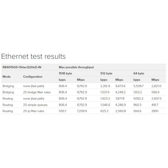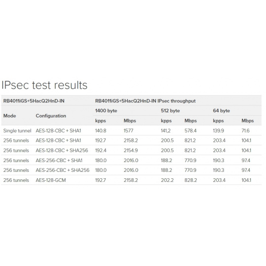 RB4011iGS+5HacQ2HnD-IN dokáže routovat až 2,5 Gbps, díky integrovanému akcelerátoru má v tunelu s robustním šifrování AES-256-CBC + SHA256 propustnost až 2 Gbps.