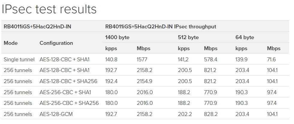 RB4011iGS+5HacQ2HnD-IN dokáže routovat až 2,5 Gbps, díky integrovanému akcelerátoru má v tunelu s robustním šifrování AES-256-CBC + SHA256 propustnost až 2 Gbps.