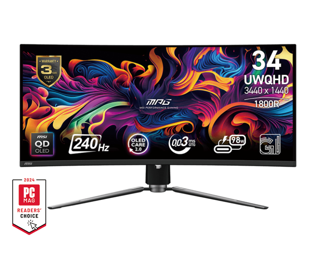 MSI Gaming monitor MPG 341CQPX QD-OLED, 34,18" QD-OLED zakřivený/3440x1440 (UWQHD)/240Hz/0,03ms/2xHDMI/DP/USB-A,B,C/Výškově nast.