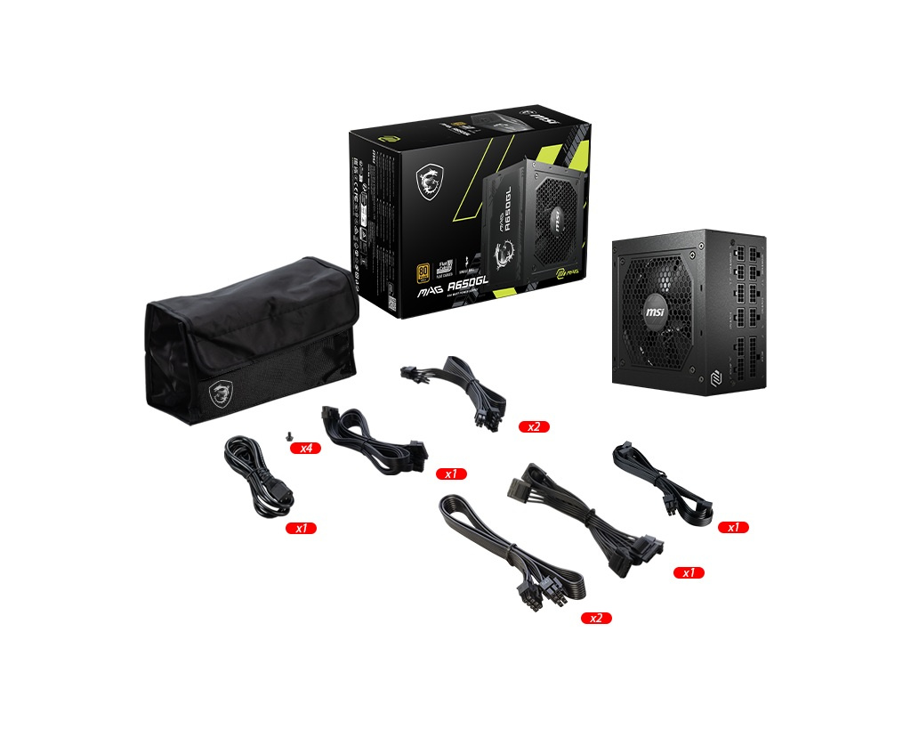MSI MAG A650GL Parametry: *Hodnocení účinnosti: 80 PLUS Gold (up to 90%) *Modular: Yes (full modular) *Velikost ventilátoru: 120 mm *Ložisko ventilátoru: Fluid Dynamic Bearing *Rozměry (HxŠxV): 140 x 150 x 86 mm *Typ PFC: Active PFC *Rozsah vstupního napětí: 100~240 VAC *Power Watt: 650W *Rozsah vstupní frekvence: 47-63Hz *Ochrana: OCP / OVP / OPP / OTP / SCP / UVP *ATX (24 pin): 1 *EPS (4+4 pin): 2 *PCI-E (6+2 pin): 4 *SATA (15 pin): 6 *PERIPHERAL (4 pin): 3 *FDD (4 pin): 1 Záruka: 3 roky Odkaz na stránky výrobce: https://www.msi.com/Power-Supply/MAG-A650GL/Specification