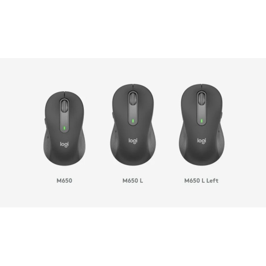 Vyberte si myš Signature M650, která vám bude nejlépe vyhovovat. Model M650 doporučujeme pro malé až střední ruce, model M650 L pro velké ruce a model M650 L Left pro leváky. Nejste si jisti, která myš je pro vás nejvhodnější? Viz obrázek a rozměry.