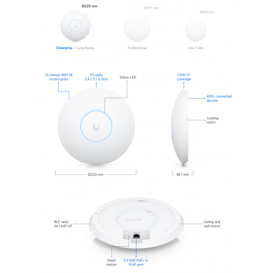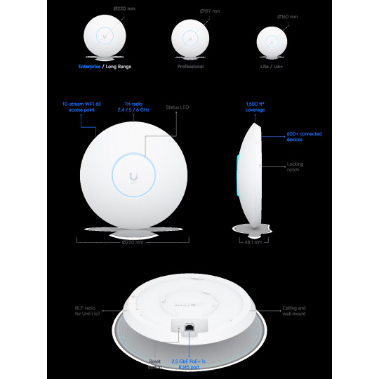 UniFi Access Point WiFi 6 Enterprise je vysoce výkonný triple-band WiFi 6/6E přístupový bod (2,4GHz, 5GHz a 6GHz) a je ideální AP do velmi vytížených míst jako jsou haly, sklady či kanceláře.