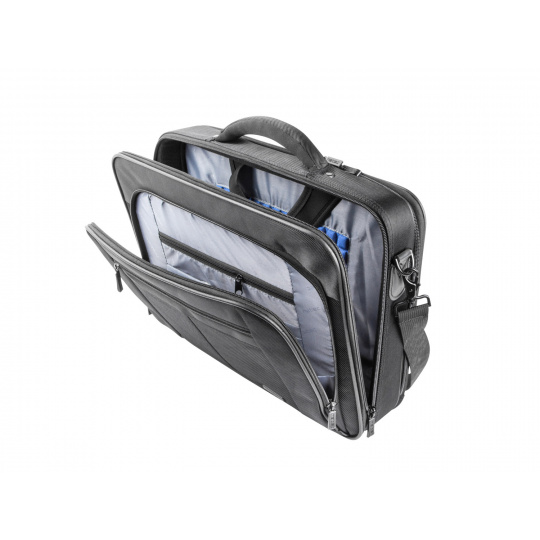 - Tři oddíly: hlavní pro notebook, přední s mnoha kapsami a organizéry, zadní na dokumenty.