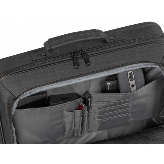 - V přední přihrádce jsou dvě zasouvací kapsy na elektroniku, kancelářské příslušenství.