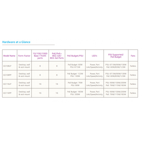 Model Description : GS116PP 16-port PoE+ Gigabit Ethernet Unmanaged switch with 183W total power budget