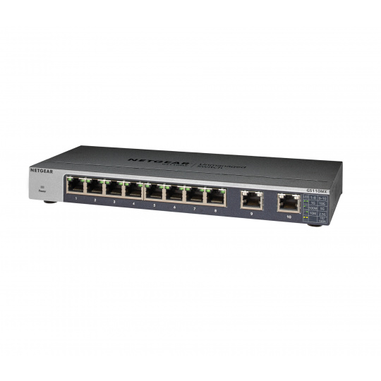 Neřiditelný přepínač GS110MX je vybaven osmi gigabitovými ethernetovými porty doplněnými o dvojici multigigabitových portů určených pro uplink. Tyto porty umožňují přenášet data v pěti odlišných rychlostech - 100 M, 1 G, 2,5 G, 5 G a 10 G, přičemž skutečná rychlost přenosu dat se automaticky přizpůsobuje potřebě připojeného zařízení. Nižší provozní náklady zajišťuje kompatibilita portů s běžným kabelovým ethernetovým připojením Cat5E. Kovové tělo přepínače GS110MX zajišťuje vysokou mechanickou odolnost, bezvětrákové provedení garantuje naprosto tichý chod a zdířky pro uchycení na stěnu či do racku umožňují velmi variabilní možnosti umístění.