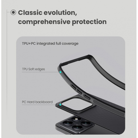 Skládá se z tvrdého a odolného plastu na zadní straně a TPU měkkého plastu na bocích.
