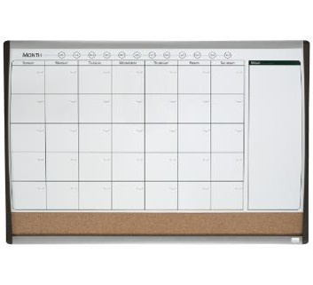 Kombinovaná tabule s měsíčním kalendářem je tvořena magnetickou tabulí s kalendářovou tabulkou stíratelnou za sucha a částí s korkovou nástěnkou. Obě části jsou zasazeny do výrazného černého a stříbrného rámu s kulatými rohy. Obsahuje pěnovou lepicí pásku, jeden magnetický černý popisovač ReWritable s mazací houbou a dva magnety. Rozměry 585 × 430 mm.