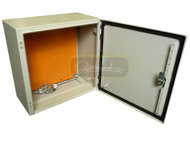 Rozvaděčovou skříň OC tvoří svařovaná konstrukce z plechu síly 1,3 mm, uzpůsobená pro uchycení na stěnu.