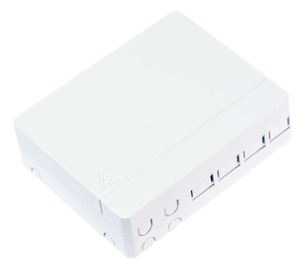 Domácí 4-otvorová ukončovací krabice, do které lze namontovat adaptéry SC simplex nebo LC duplex. Výrobek je uzpůsoben pro montáž na stěnu, uvnitř má odklápěcí vaničku s místem pro návarky a ukrytí náhradního kabelu. Otvor v zadním panelu je široký - snadno jím protáhnete kabel se špičkou.