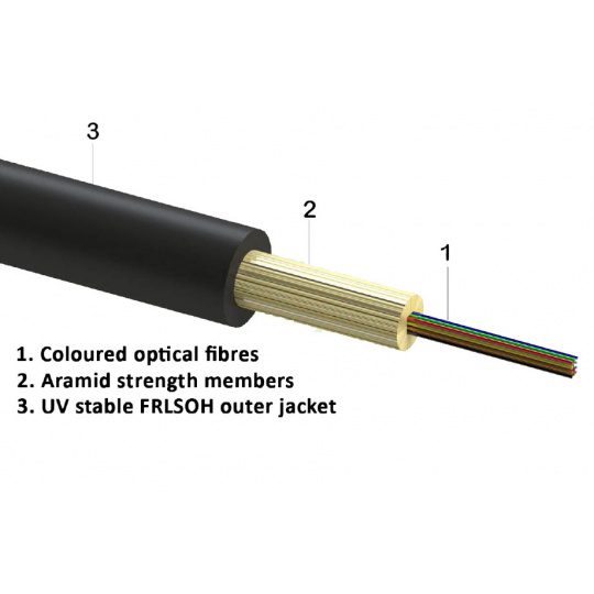 Použitá jsou vlákna G.657A1. Konstrukce kabelu dovoluje poloměr ohybu až 1,5 cm (bez zátěže), 3 cm (při zátěži), což umožňuje s kabelem pracovat jako s běžným UTP kabelem.